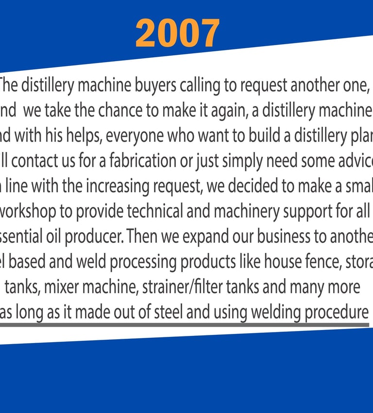 Memulai langkah sebagai bengkel rumahan di kawasan Depok sejak tahun 2002, kini kami memantapkan langkah untuk membangun sebuah perusahaan bernama PT. WARDHANA BERKARYA MANDIRI demi menguatkan komitmen sebagai produsen peralatan industri dan konstruksi yang mengedepankan kualitas hasil pekerjaan untuk menjamin mutu dan kepuasan konsumen. Dengan bermodalkan pengalaman dan tenaga ahli, maka hasil terbaik-lah yang akan kami berikan kepada anda.